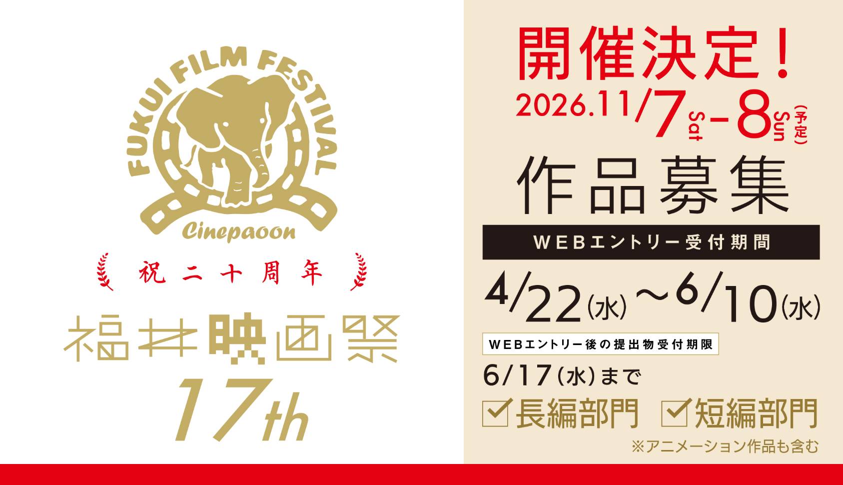 2026.04.21 福井映画祭17TH 福井映画祭17TH 開催決定! 今年で20周年を迎える「福井映画祭17TH」の開催が決定しました。 2026年11月7日(土)・8日(日)、福井メトロ劇場にて開催予定です。 そして本日、作品募集のスケジュールも発表! 📩募集開始:2026年4月22日 ⏳締切:2026年6月10日 次世代の才能と出会うコンペティション。 たくさんのご応募をお待ちしています!
